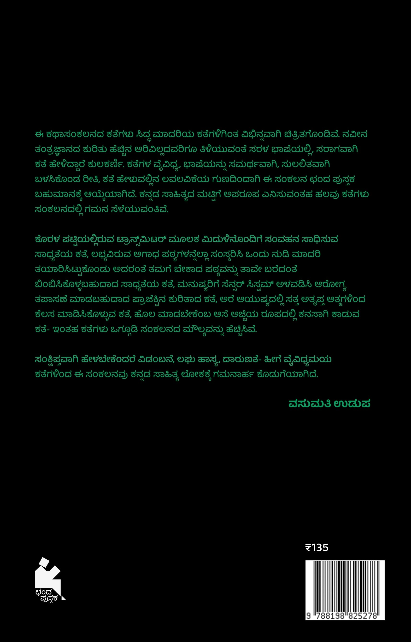 ಕೊರಳ ಪಟ್ಟಿಯಲ್ಲಿರುವ ಟ್ರಾನ್ಸ್ಮಿಟರ್ ಮೂಲಕ ಮಿದುಳಿನೊಂದಿಗೆ ಸಂವಹನ ಸಾಧಿಸುವ ಸಾಧ್ಯತೆಯ ಕತೆ, ಲಭ್ಯವಿರುವ ಅಗಾಧ ಪಠ್ಯಗಳನ್ನೆಲ್ಲಾ ಸಂಸ್ಕರಿಸಿ ಒಂದು ನುಡಿ ಮಾದರಿ ತಯಾರಿಸಿಟ್ಟುಕೊಂಡು ಅದರಂತೆ ತಮಗೆ ಬೇಕಾದ ಪಠ್ಯವನ್ನು ತಾವೇ ಬರೆದಂತೆ ಬಿಂಬಿಸಿಕೊಳ್ಳಬಹುದಾದ ಸಾಧ್ಯತೆಯ ಕತೆ, ಮನುಷ್ಯರಿಗೆ ಸೆನ್ಸರ್ ಸಿಸ್ಟಮ್ ಅಳವಡಿಸಿ ಆರೋಗ್ಯ ತಪಾಸಣೆ ಮಾಡಬಹುದಾದ ಪ್ರಾಜೆಕ್ಟಿನ ಕುರಿತಾದ ಕತೆ, ಅರೆ ಆಯುಷ್ಯದಲ್ಲಿ ಸತ್ತ ಅತೃಪ್ತ ಆತ್ಮಗಳಿಂದ ಕೆಲಸ ಮಾಡಿಸಿಕೊಳ್ಳುವ ಕತೆ, ಹೊಲ ಮಾಡಬೇಕೆಂಬ ಆಸೆ ಅಜ್ಜಿಯ ರೂಪದಲ್ಲಿ ಕನಸಾಗಿ ಕಾಡುವ ಕತೆ- ಇಂತಹ ಕತೆಗಳು ಒಗ್ಗೂಡಿ ಸಂಕಲನದ ಮೌಲ್ಯವನ್ನು ಹೆಚ್ಚಿಸಿವೆ.