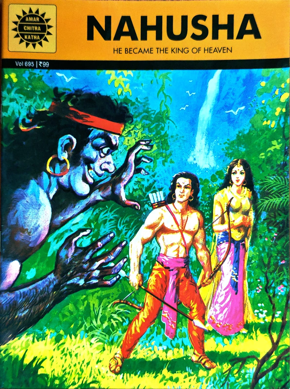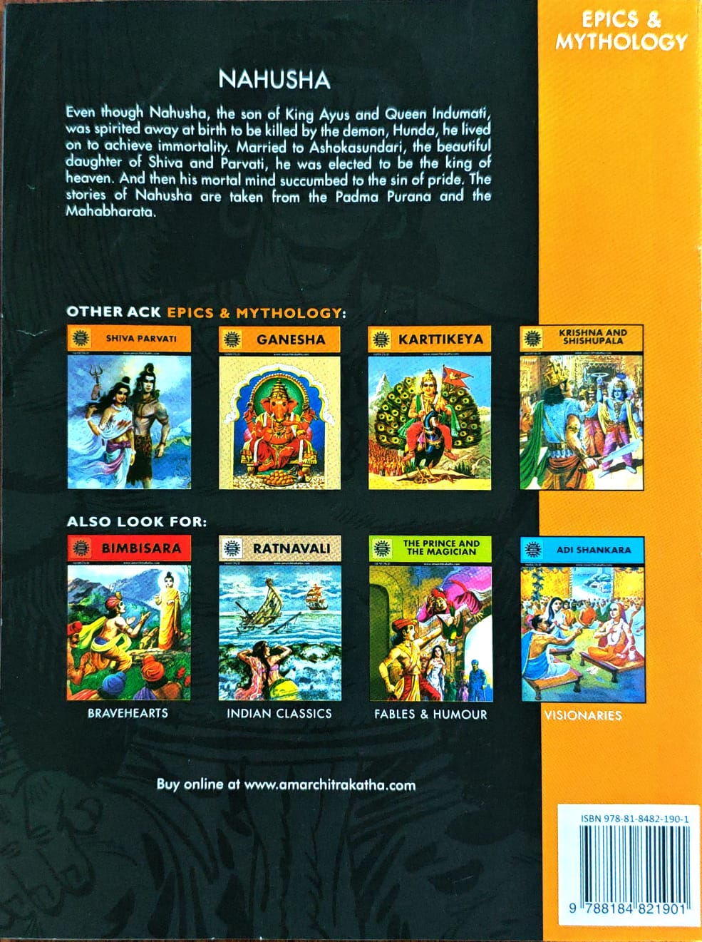 Even though Nahusha, the son of King Ayus and Queen Indumati, was spirited away at birth to be killed by the demon, Hunda, he lived on to achieve immortality. Married to Ashokasundari, the beautiful daughter of Shiva and Parvati, he was elected to be the king of heaven. And then his mortal mind succumbed to the sin of pride. The stories of Nahusha are taken from the Padma Purana and the Mahabharata.